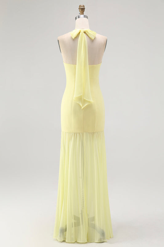 Yellow Halter Sheath Ruched Tie Back Long Bridesmaid Dress