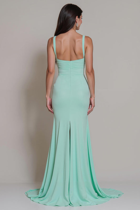 • Mint Green Satin Sweetheart Ruched Long Bridesmaid Dress with Slit