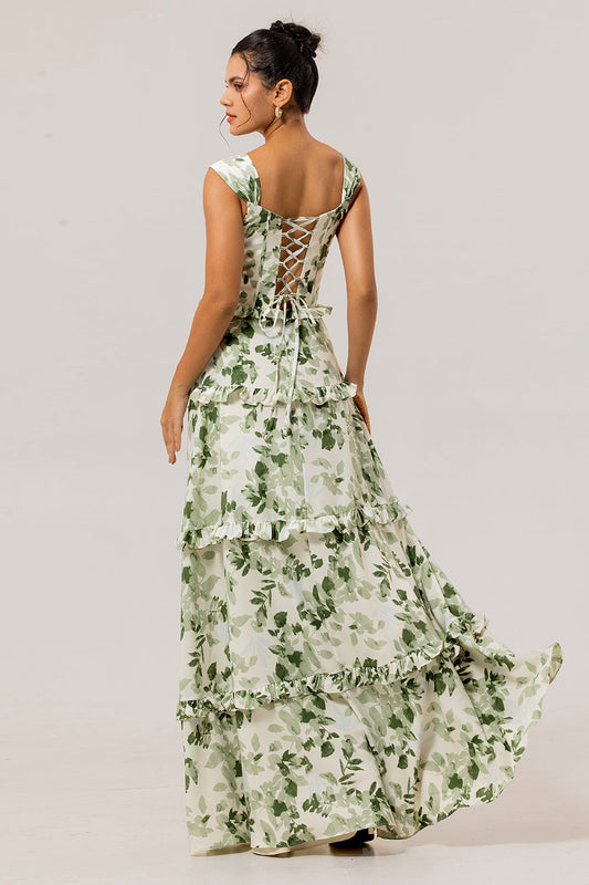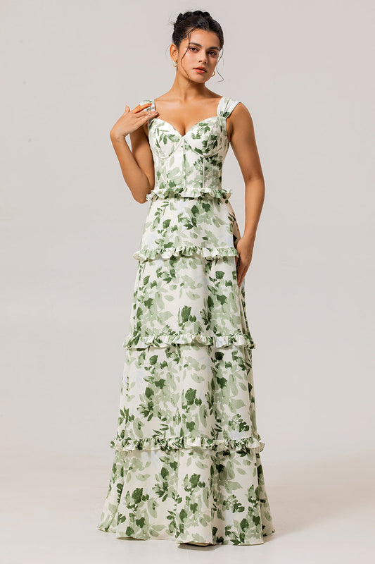 Green Floral Ruffled Corset A Line Long Bridesmaid Dress