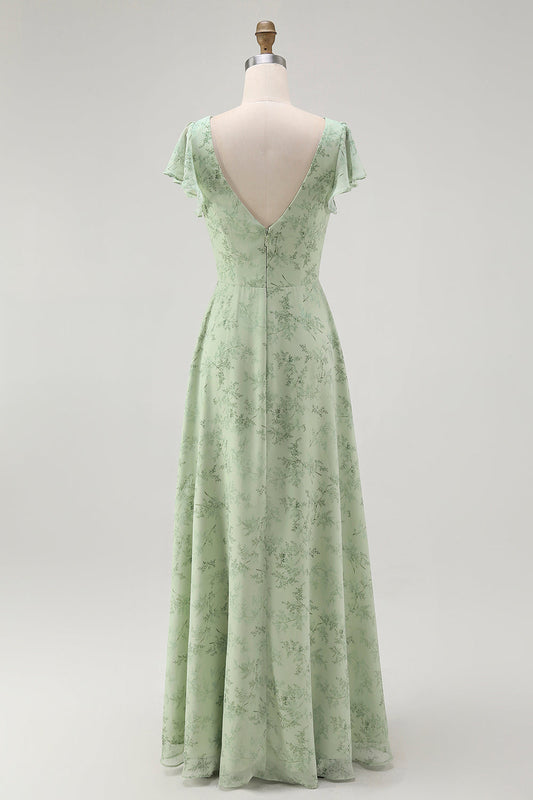 Sage Green Floral A Line Bridesmaid Dress with Slit
