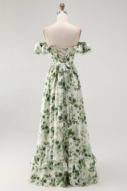 Green Floral A Line Off The Shoulder Ruffled Bridesmaid Dress