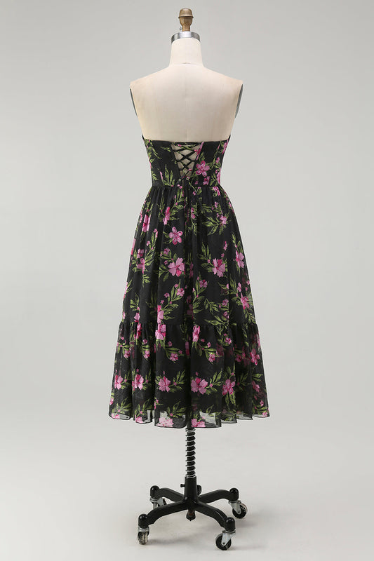 • Strapless Black Pink Floral A Line Midi Bridesmaid Dress