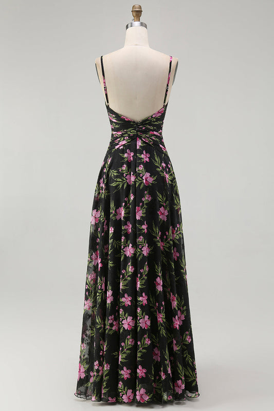 • Black Pink Floral Spaghetti Straps A Line Long Bridesmaid Dress