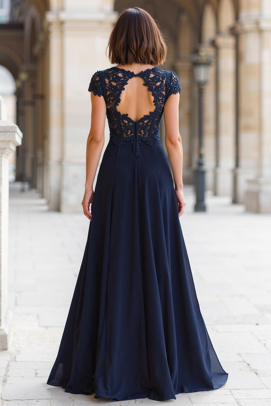 Navy A-Line Boat Neck Short Sleeves Chiffon Long Mother Of the Bride Dress with Lace Appliques