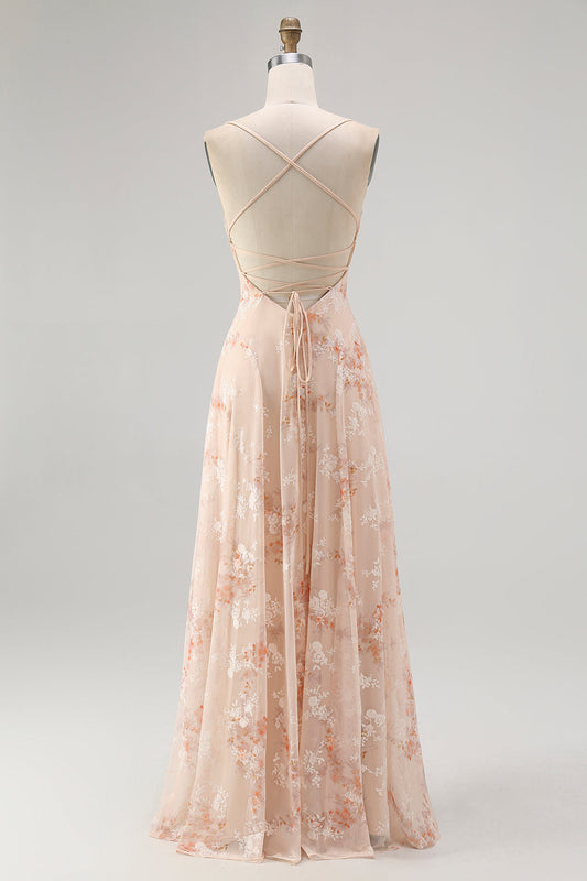 Champagne A Line Cowl Neck Floral Burnout Long Bridesmaid Dress