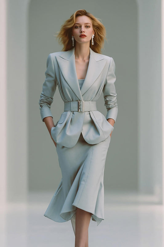 Grey Pencil Peak Lapel 2 Piece Midi Business Suits with Belt