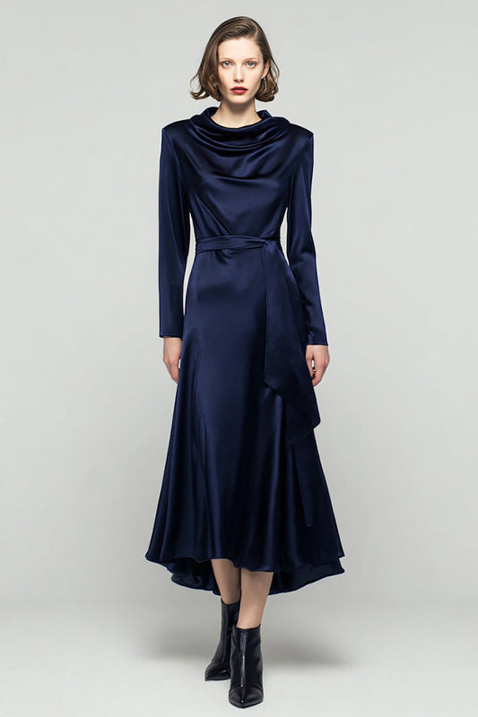 • Navy Cowl neck Long Sleeve Work Dress With Belt