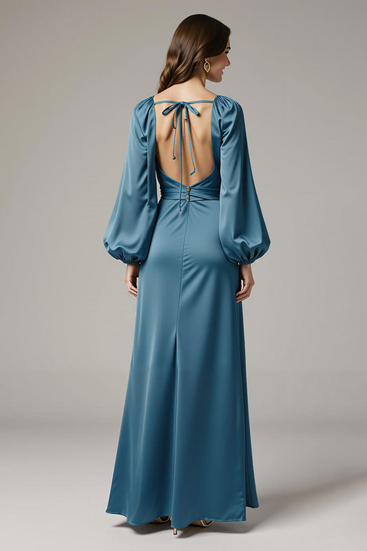 Grey Blue Sheath Satin V-Neck Long Black Tie Dress with Sleeves