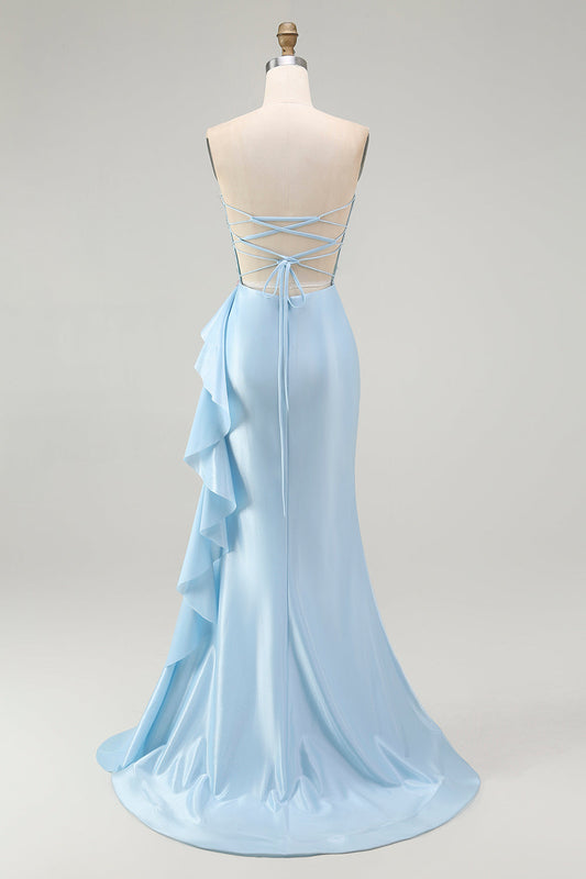 Sparkly Light Blue Strapless Corset Mermaid Beaded Long Prom Dress with Slit