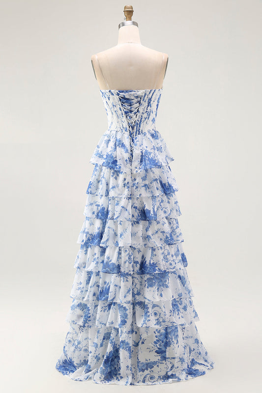 Blue White Flower A-Line Tiered Corset Long Prom Dress with Slit