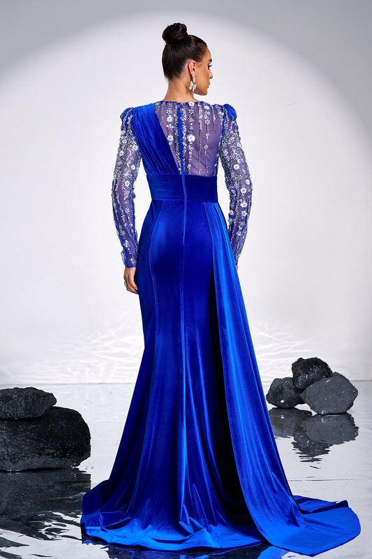 Royal Blue Beaded Mermaid Velvet Prom Dress