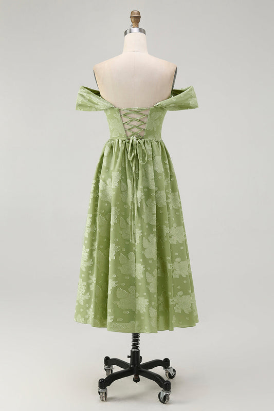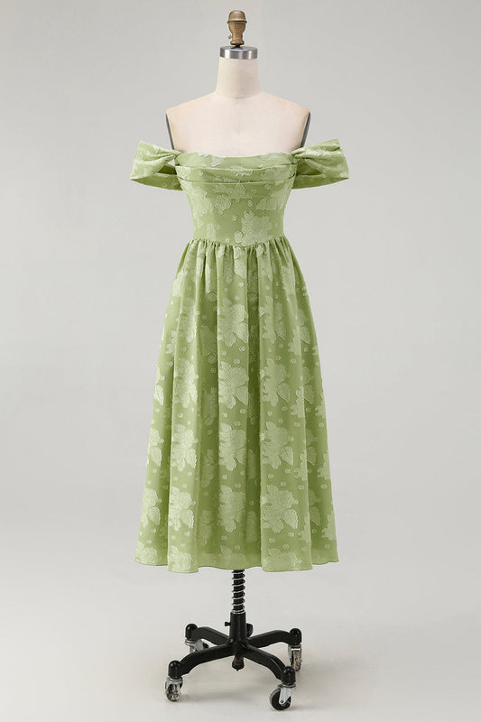 Sage Green Floral A Line Off The Shoulder Midi Bridesmaid Dress