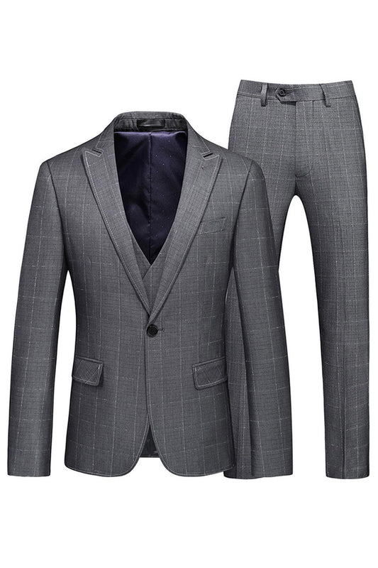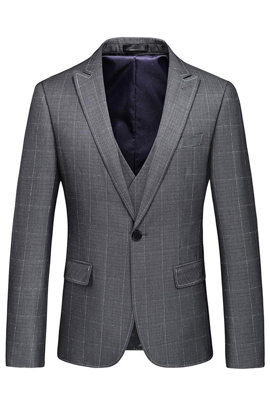 Men's Grey Plaid Peak Lapel 3 Pieces Formal Suits