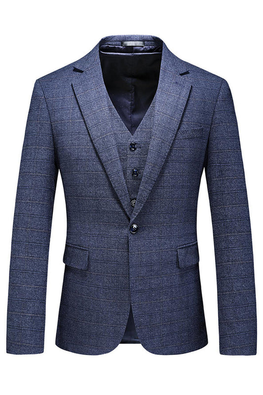 Men's Dark Blue Plaid Notched Lapel 3 Pieces Prom Suits