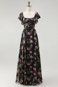 Black Pink Floral A Line Square Neck Short Sleeves Bridesmaid Dress