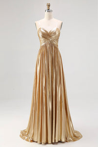 Chic Gold A Line Deep-V Neck Satin Long Prom Dress
