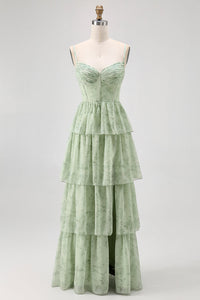 Dusty Sage A Line Corset Tiered Chiffon Long Bridesmaid Dress with Slit