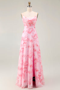 Pink Floral Cowl Neck A Line Maxi Dress with Slit