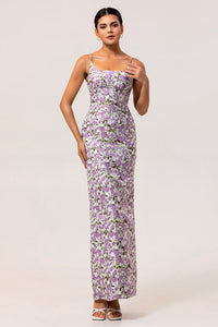 Purple Floral Sheath Printed Spaghetti Straps Long Bridesmaid Dress