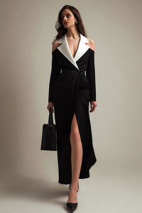 Sheath Notched Lapel Black and White Work Dress With Slit